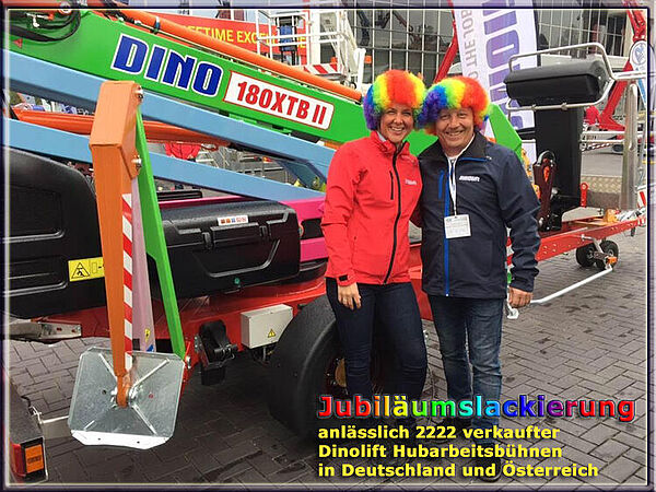 Wir danken allen Interessenten und Kunden, welche uns auf der APEX am Dinolift Stand besucht haben. Karin Nars von Dinolift und Andreas Hänel von Hematec freuen sich über 2222 verkaufte Dinolift Hubarbeitsbühnen, welche in den letzten 22 Jahren in Deutschland und Österreich verkauft wurden. Aus diesem Anlass wurde dieser Dinolift vom Typ DINO 180XTB II in einer Jubiläumslackierung hergestellt und nach Deutschland geliefert.